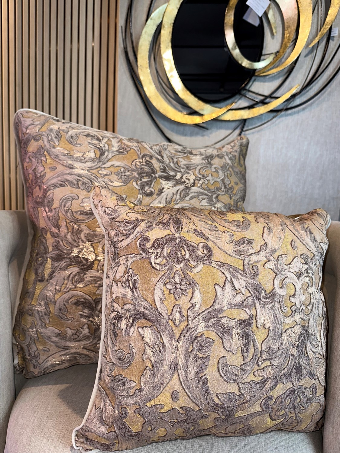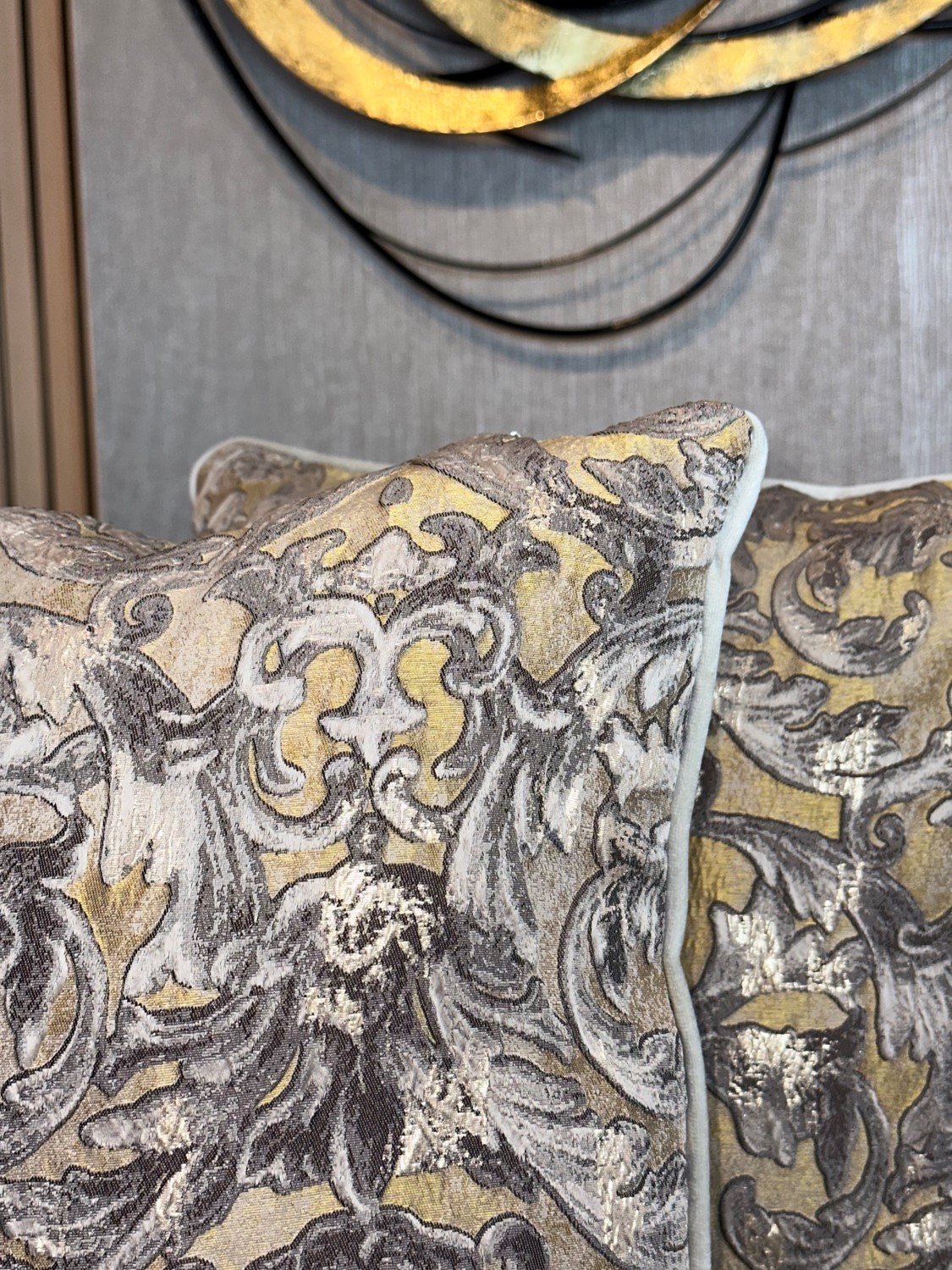 Descripción: Cojín decorativo importado de alta gama con acabados exclusivos de finos textiles